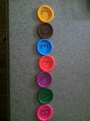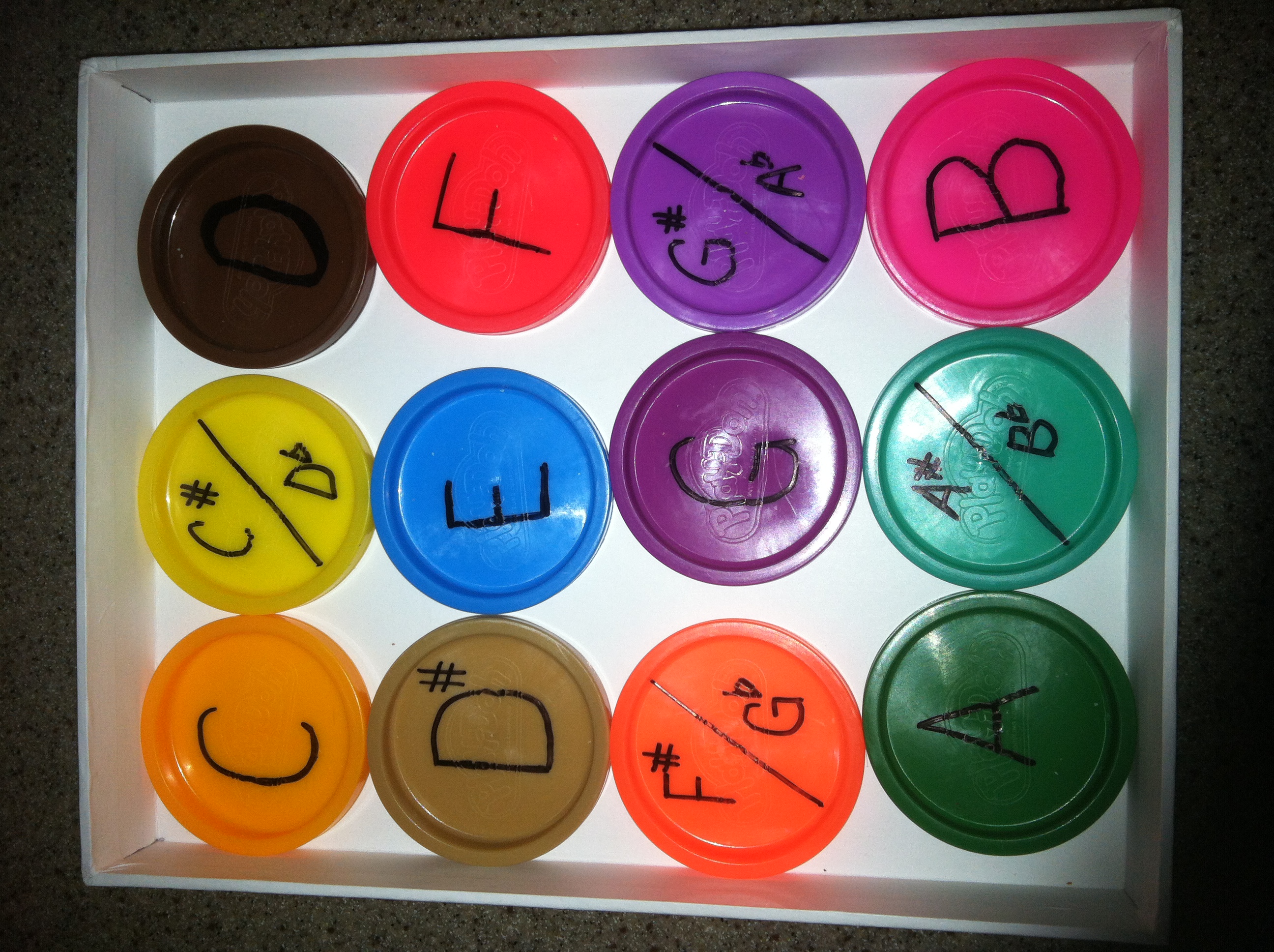 I wrote out all the music alphabet (including sharps and flats) on the tops from empty Play Doh containers. I can think of so many ways to use these in music teaching.