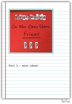 Since last week’s post about Mystery Practice Assignments got so much attention on Pinterest and since my students seem to be enjoying the suspense involved in having to wait to find out what their practice assignment for each day is, I’ve decided to do a follow-up. Here are some of the mystery assignments I will be using this week. These are some of the tried and true favorites that I have used over the years in students’ notebooks as well as one idea that came from a comment on a post about How To Get Kids To Sing. Also, this week there will only be 4 mystery assignments – one for every other day. (Hmmm…could this be another way to reinforce the concept of skips?)